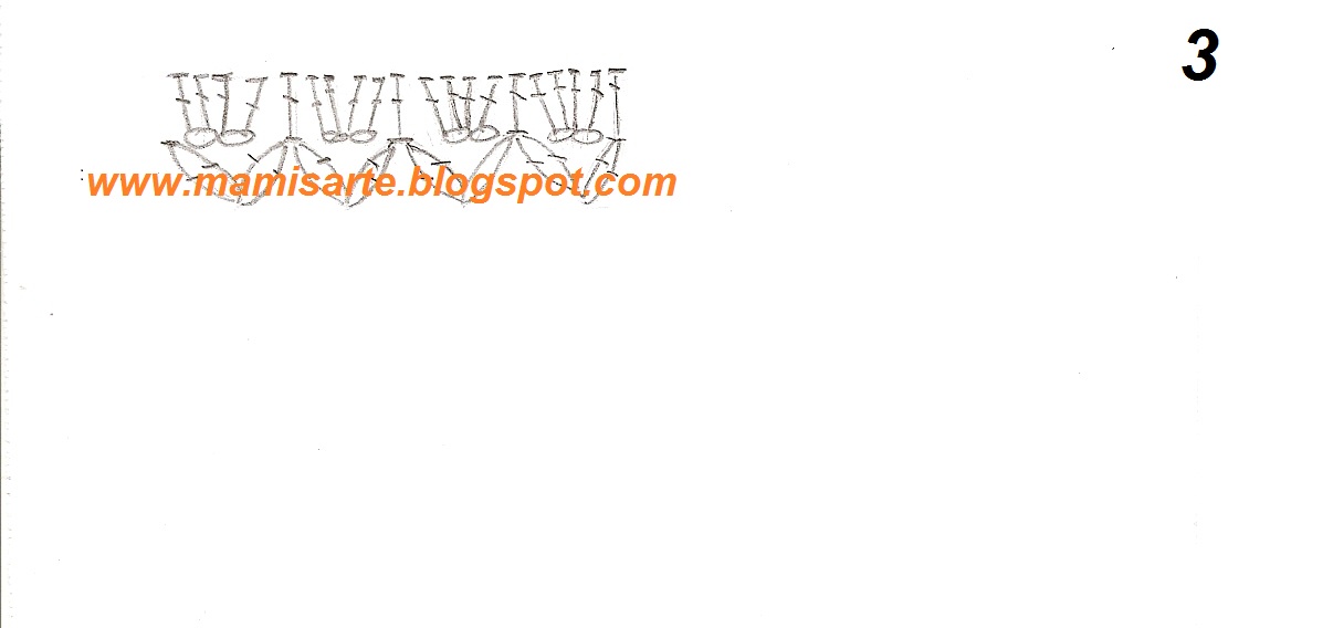 - 2 pontos alto fechados juntos, 2 correntinhas, 2 pontos alto fechados juntos ( no mesmo ponto de base); pule 3 pontos de base e repita até o final da carr.