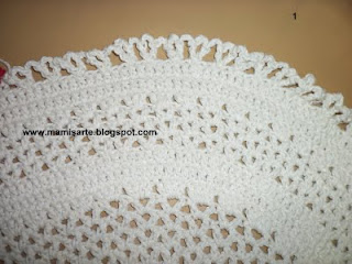 1º passo= em volta do tapete, trabalhe: *1 p.a., 3 corr., 1 p.a. (no mesmo ponto de base), 3 corr., ( pulando 2 pontos de base nas laterais e 1 , 2 pontos de base nas pontas) repete de a*. Veja imagem nº 1.
