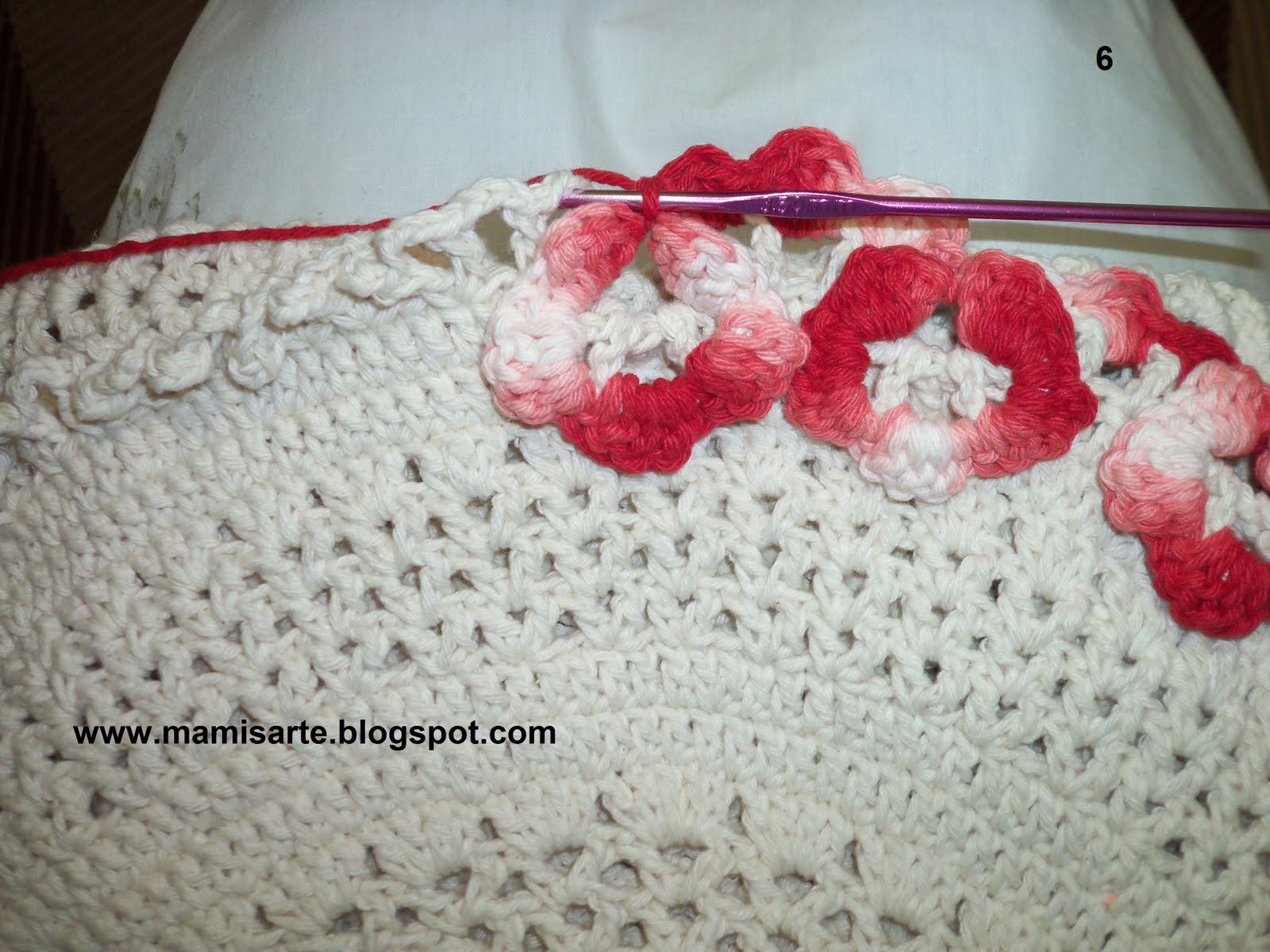 1º passo= em volta do tapete, trabalhe: *1 p.a., 3 corr., 1 p.a. (no mesmo ponto de base), 3 corr., ( pulando 2 pontos de base nas laterais e 1 , 2 pontos de base nas pontas) repete de a*. Veja imagem nº 1.