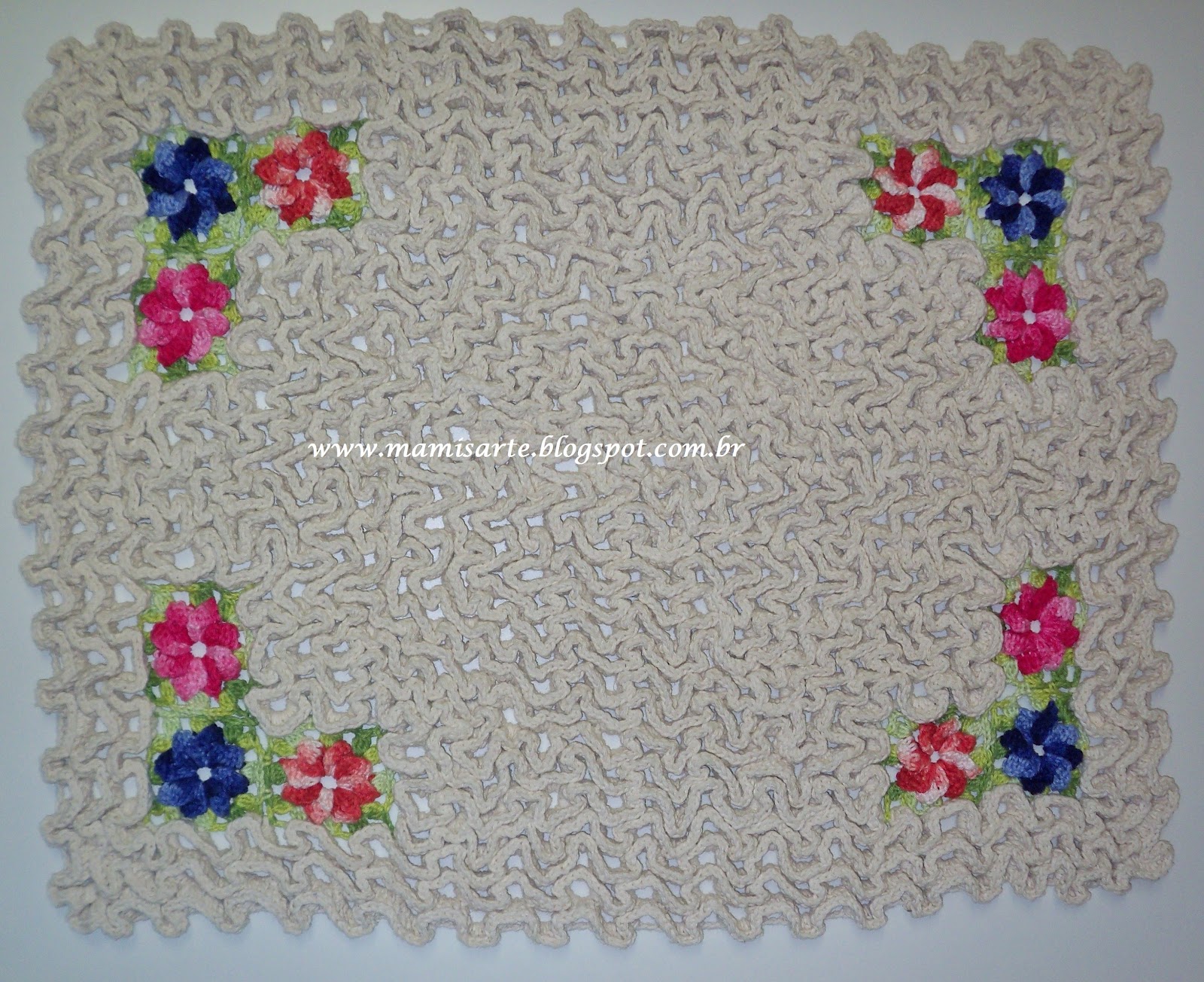 Foto 2ª ( veja grafico na foto 4ª): Square = No laço mágico trabalhe a flor "Catavento". Com o fio verde trabalhe 1 carr.: *3 p.a.j., 4 corr., 3 p.a.j., 2 corr., 4 p.a.j., 2 corr*. repete de *a*. Prenda-os ao tapete.