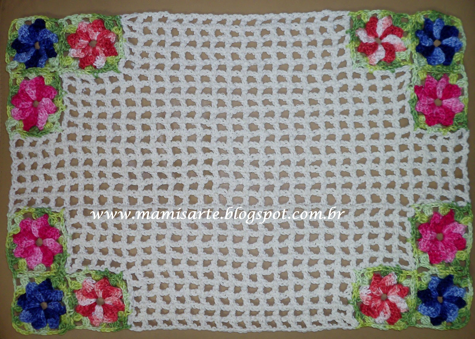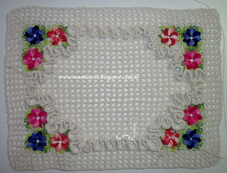 Foto 2ª ( veja grafico na foto 4ª): Square = No laço mágico trabalhe a flor "Catavento". Com o fio verde trabalhe 1 carr.: *3 p.a.j., 4 corr., 3 p.a.j., 2 corr., 4 p.a.j., 2 corr*. repete de *a*. Prenda-os ao tapete.