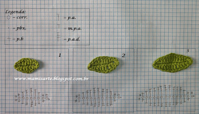 Folha- Gráfico 2: faça 12 corr. e trabalhe: 1 p.b. ( a partir da 3ª corr. a contar da agulha), 1 m.p.a., 2 p.a., 2 p.a.d., 2 p.a., 1 m.p.a., 4 p.b.,1 m.p.a., 2 p.a., 2 p.a.d., 2 p.a., 1 m.p.a., 1 p.b. e prende em pbx.