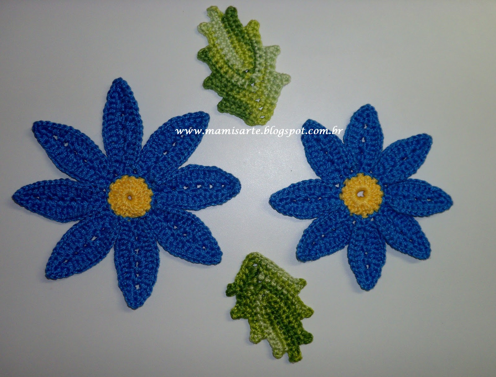 A 2ª carr. trabalhe 2 m.p.a., 2 p.a., 2 p.a. no mesmo ponto de base, 2 p.a.a., 3 p.a., 2 m.p.a., 2 p.b., 1 corr., 2 p.b. ( nas 2 corr. da ponta), 2 m.p.a., 3 p.a., 3 p.a.a., 2 p.a. no mesmo ponto de base, 2 p.a., 2 m.p.a.. Ao terminar uma pétala já inicie a outra sem precisar prender o ponto.