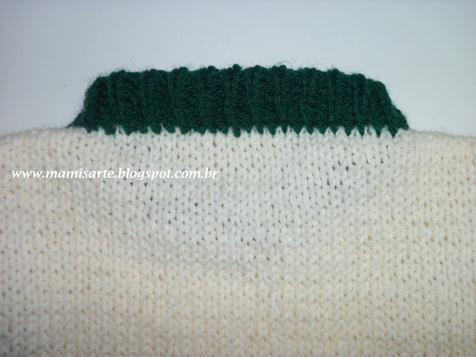Gola: costure os ombros, com a ag. circular retome os p. deixados à espera, acrescente 4 p. em cada lateral ( são os 2 cm. a mais da parte das costas), amarre o fio verde e trabalhe em ponto de barra 1/1 por 7 cm. ou mais ( opcional); dobre-a e costure-a.