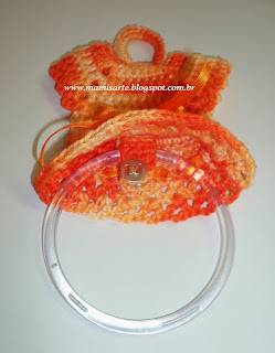 Faça a argola para pendurar: prende o fio em p.bx., suba 14 corr., prenda em p.bx. e trabalhe 24 p.b. no arco.