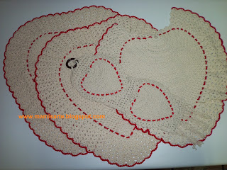 Trabalhe 5 motivos completos mais a carreira em ponto filé para o passa fita, trabalhe 1 carreira de acabamento em ponto V ( 1 p.a., 2 corr., 1 p.a. - pulando 3 pontos de base).