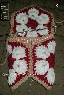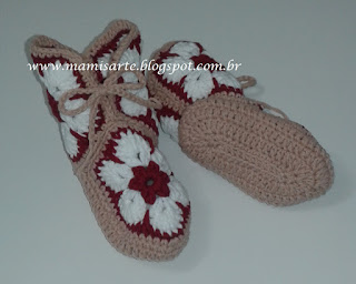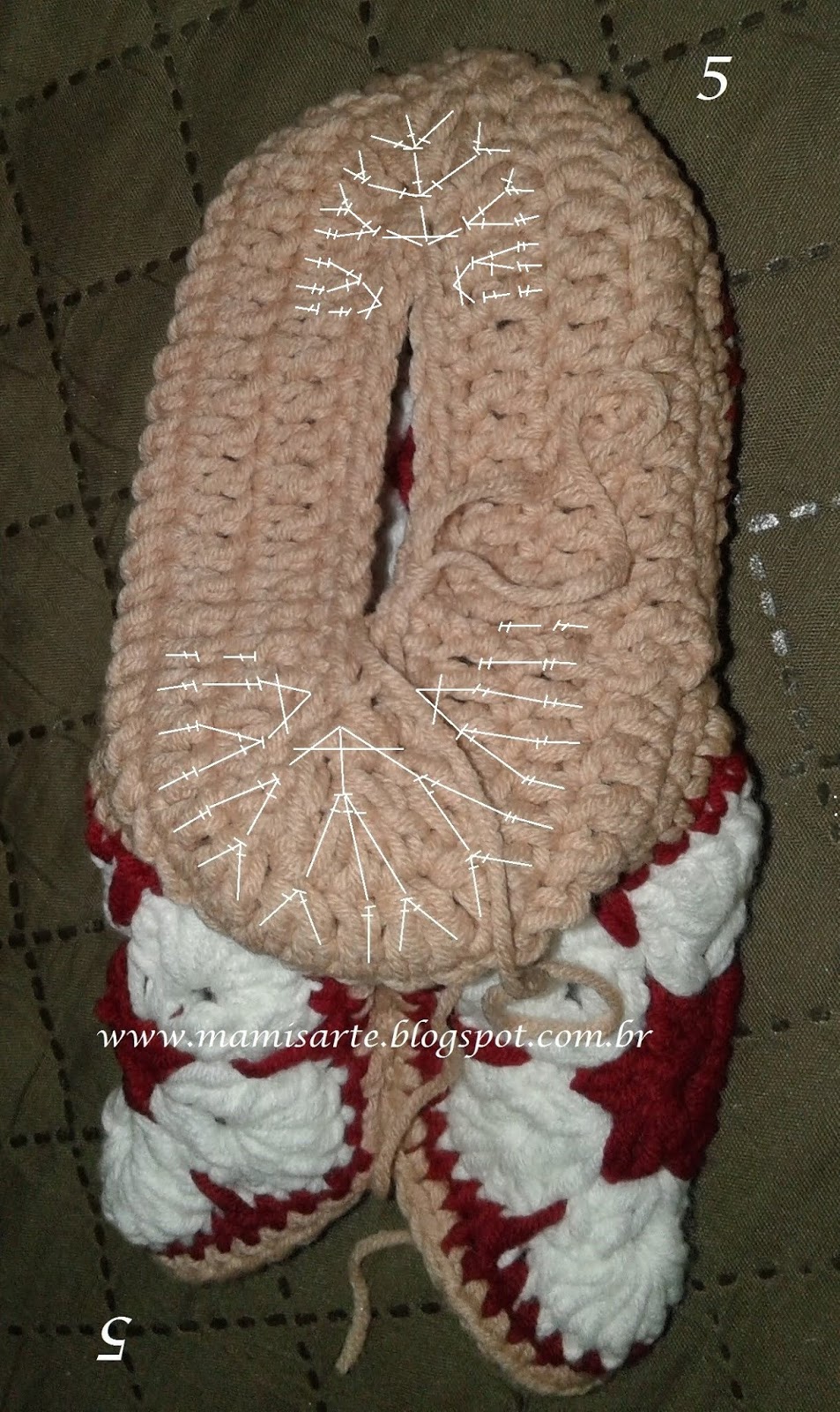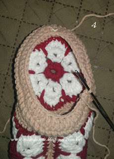 - 4ª carr. = na parte central do calcanhar, trabalhe 2 p.a.j. ( 2 vezes), 3 p.a.j., 2 p.a.j. ( 2 vezes), e na parte central da frente trabalhe idem; as laterais trabalhe ponto sobre ponto em p.a..