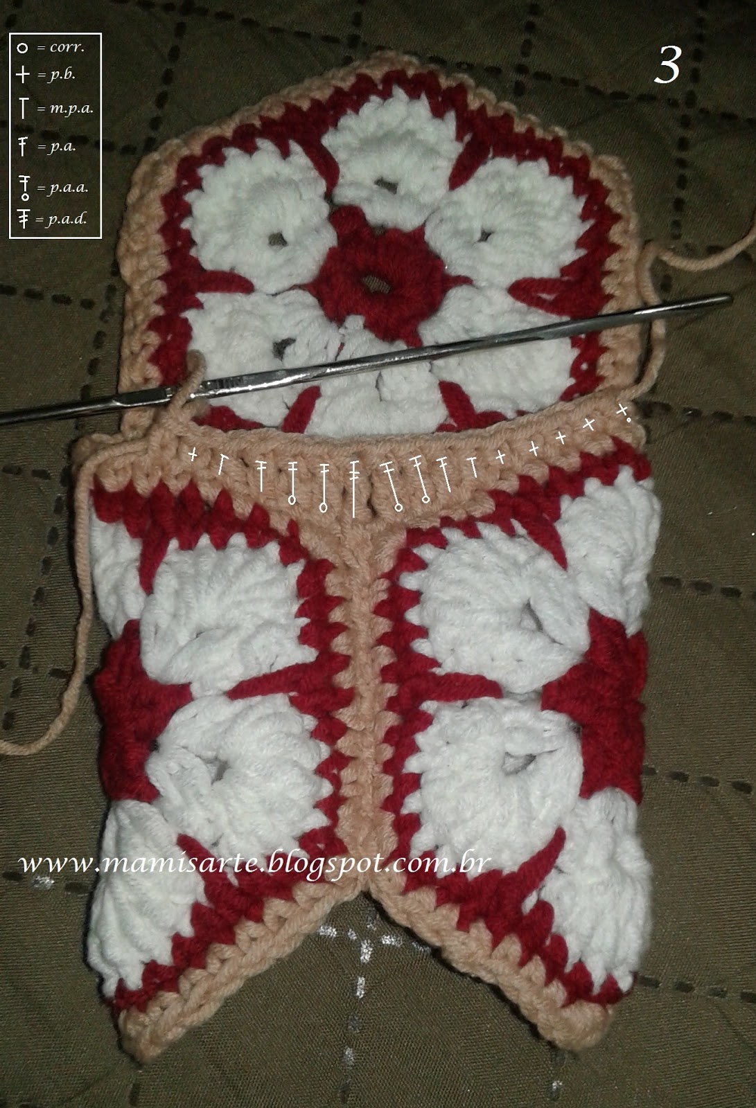 - Conte 13 pontos centrais ( 6 à esquerda, 1 na união dos hexágonos e 6 à direita) e nestes trabalhe = 2 p.b., 1 m.p.a., 1 p.a., 2 p.a.a., 1 p.a.d., 2 p.a.a., 1 p.a., 1 m.p.a., 2 p.b.. . Trabalhe em p.b. a lateral, e na parte central da frente ( 3 pontos centrais) trabalhe 1 p.b., pule um ponto e trabalhe 1 p.b.; outra lateral em p.b.